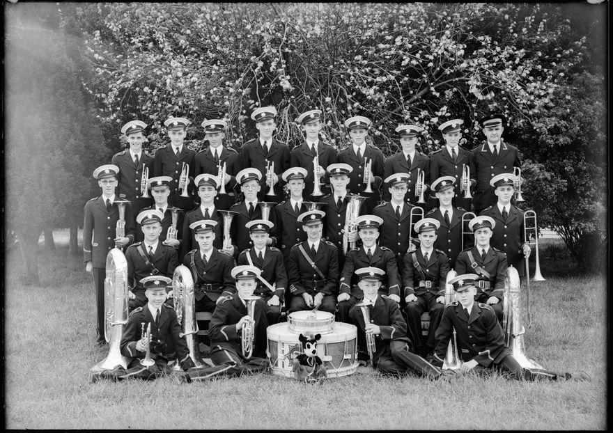 The Palmerston North Silver Band complete with instruments and 'Mickey Mouse' mascot. Individual members are unidentified.
