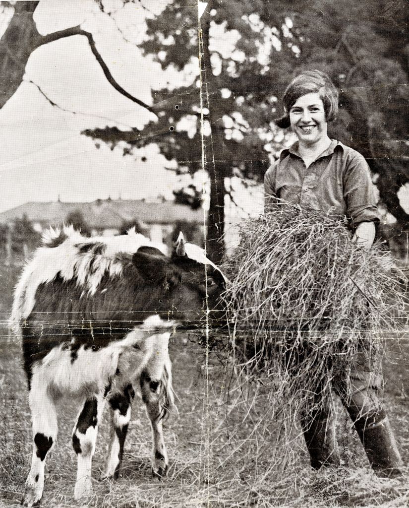 A unidentified woman feeding a cow. This image appeared in New Zealand Free Lance magazine in either the 20 October or 12 November, 1930 issue.