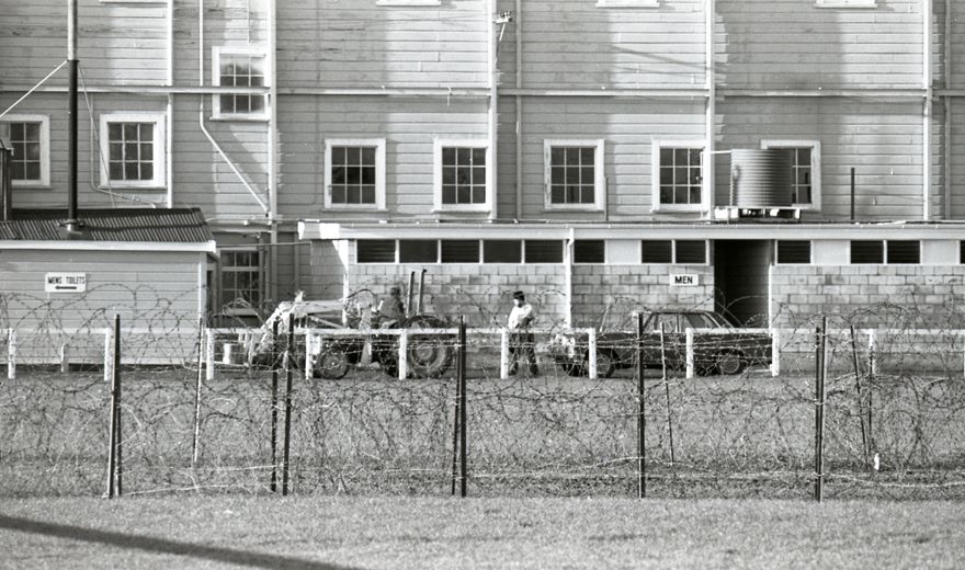 This image was taken (but not used) for a story that ran in The Manawatu Evening Standard on 01 August 1981. Barbed wire was erected around the Showgrounds and barricades blocked parts of Cuba Street in anticipation of anti-Apartheid and anti-Springbok Tour protests during the rugby match played between the Springboks and Manawatū on 1 August 1981.