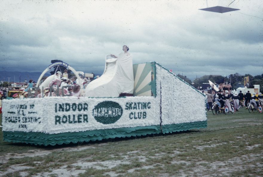 The Roller Skating Club float featured a large roller skate on a decorated vehicle, at the Palmerston North Showgrounds in Pascal Street.
