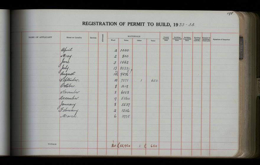 Page from the third Register of Building Permits for Palmerston North Borough Council from April 1922 to March 1935.