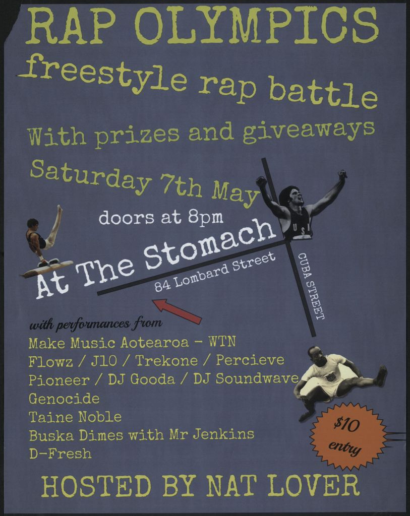 Rap Olympics. freestyle rap battle. With prizes and giveaways. Saturday 7th May. doors at 8pm At The Stomach 84 Lombard Street Cuba Street.. With performances from : Make Music Aotearoa - WTN, Flowz, J10, Trekone, Percieve, Pioneer, DJ Gooda, DJ Soundwave, Genocide, Taine Noble, Buska Dimes with Mr Jenkins, D-Fresh. Hosted by Nat Lover.