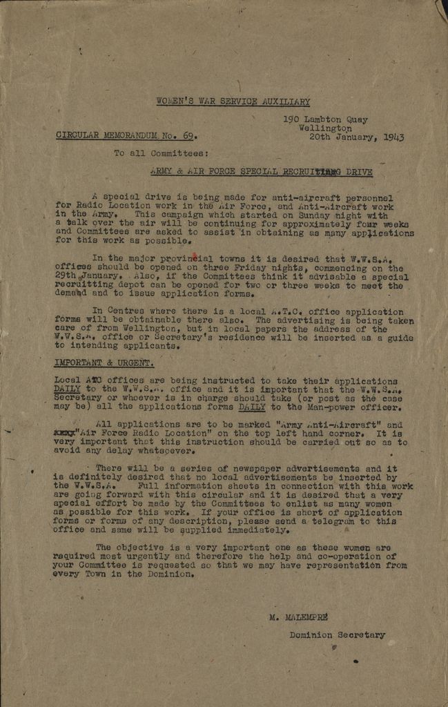 Memorandum entitled: Army and Air Force special recruiting drive. Dated 20 January 1943.