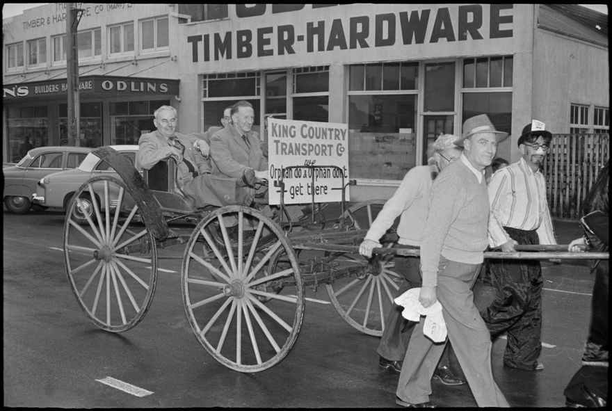 Caption: “Orphans’ Club [of Te Kuiti] members are taken for a ride by the Savage Club.”