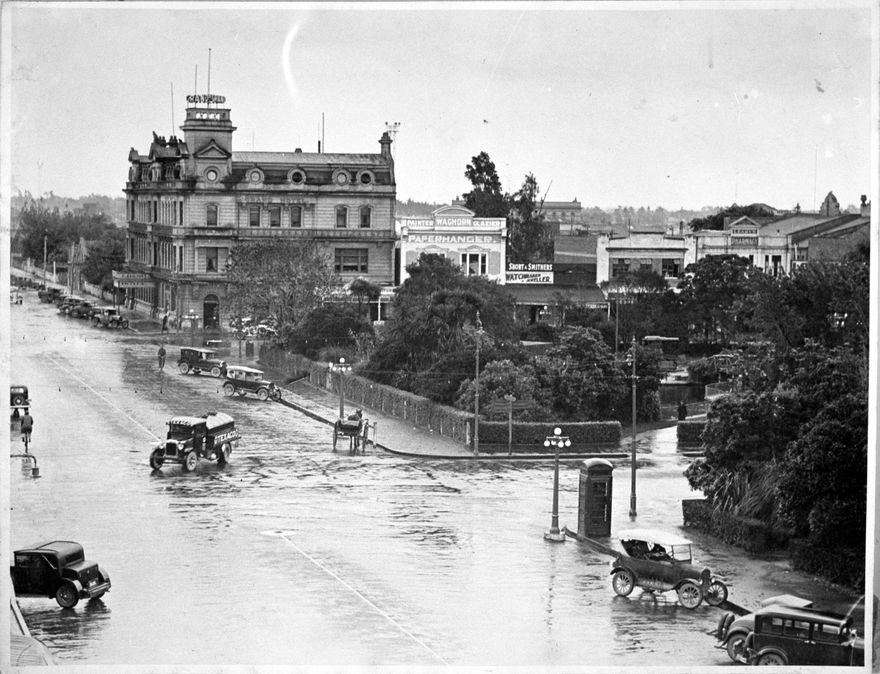 This photograph shows a rainy view of Church Street West in the 1930s. The three-storey building to the left of the photograph is the Grand Hotel, built 1906.