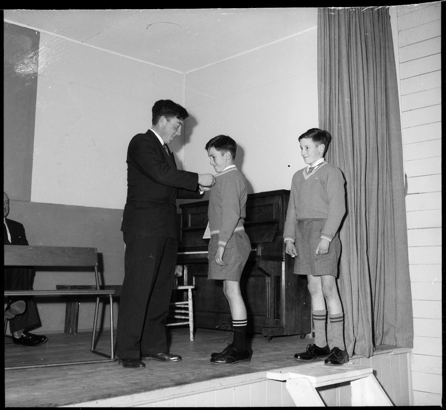 This image was not published in the Manawatu Evening Standard, taken on 26 July, 1963. [Two proud students recieved badges on stage.]