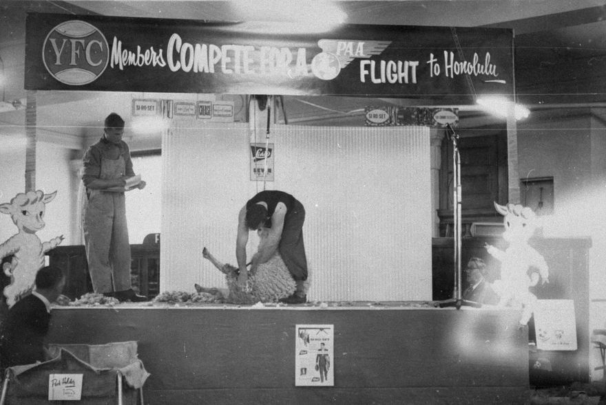 A sheep shearing competition as part of the Y F C contest to win a trip to Honolulu with Pan American Airways.