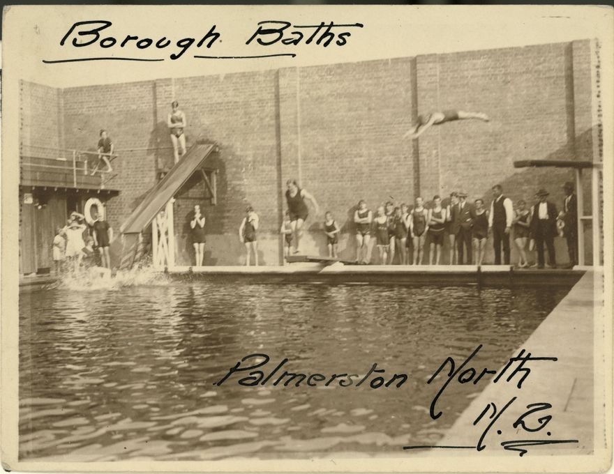 The Municipal Baths (or Borough Baths) opened in 1917 on the site of the former town morgue. The balcony to the left ran the entire length of the building's brick fence and provided extra viewing for the public during competitions.