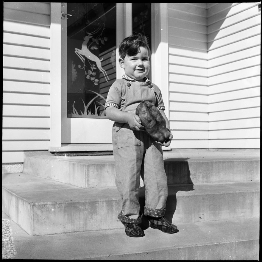 This image was taken for a story that ran in The Manawatu Evening Standard on 1 May, 1963. "Look what my father grew." That is what two-year-old Stuart Pinker, of Longburn, could well be saying. He is holding a 3lb 2oz kumera grown by his father."