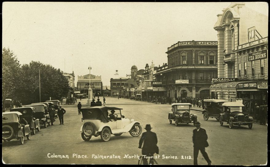This postcard shows The Square from the corner of Rangitikei Street to Coleman Place.