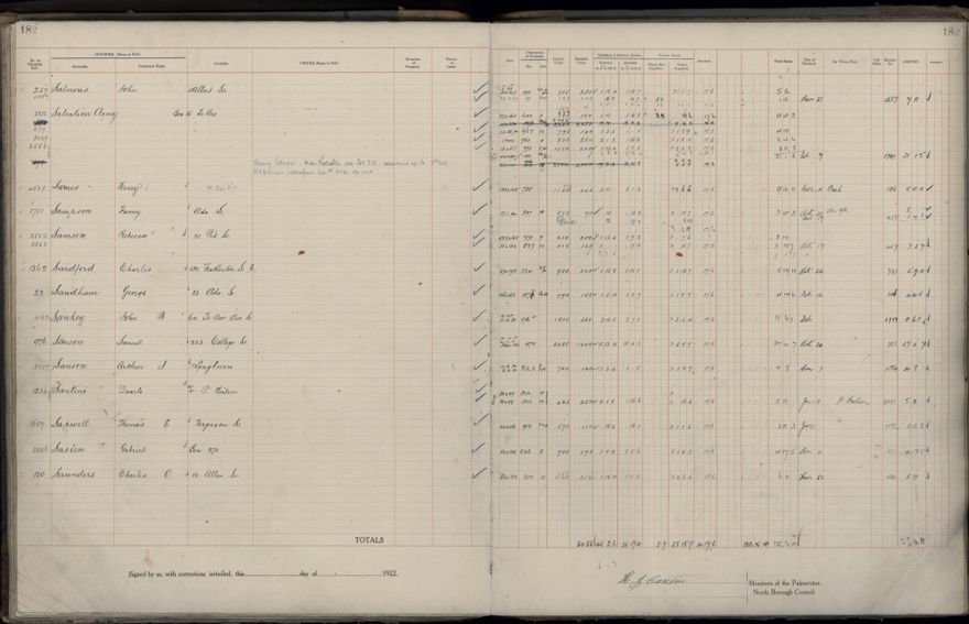 Palmerston North Borough Council rate book, listing rate payers for the years (1 April - 31 March) 1922 - 1923. Gives names, street, owner (if different to rate payer), legal description of property, capital and unimproved values and rates paid.