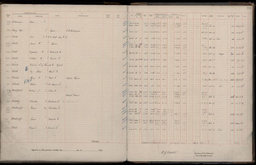 Palmerston North Borough Council rate book, listing rate payers for the years (1 April - 31 March) 1922 - 1923. Gives names, street, owner (if different to rate payer), legal description of property, capital and unimproved values and rates paid.