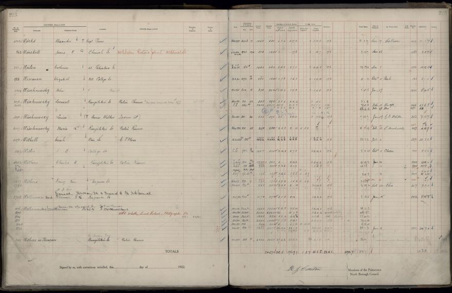 Palmerston North Borough Council rate book, listing rate payers for the years (1 April - 31 March) 1922 - 1923. Gives names, street, owner (if different to rate payer), legal description of property, capital and unimproved values and rates paid.