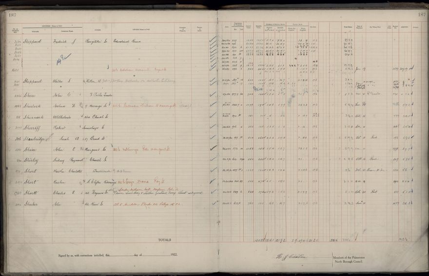 Palmerston North Borough Council rate book, listing rate payers for the years (1 April - 31 March) 1922 - 1923. Gives names, street, owner (if different to rate payer), legal description of property, capital and unimproved values and rates paid.