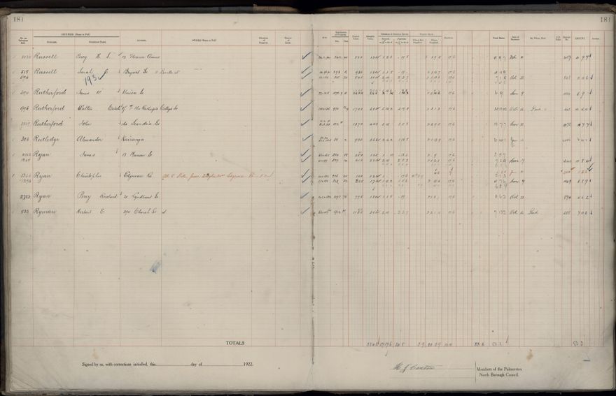 Palmerston North Borough Council rate book, listing rate payers for the years (1 April - 31 March) 1922 - 1923. Gives names, street, owner (if different to rate payer), legal description of property, capital and unimproved values and rates paid.