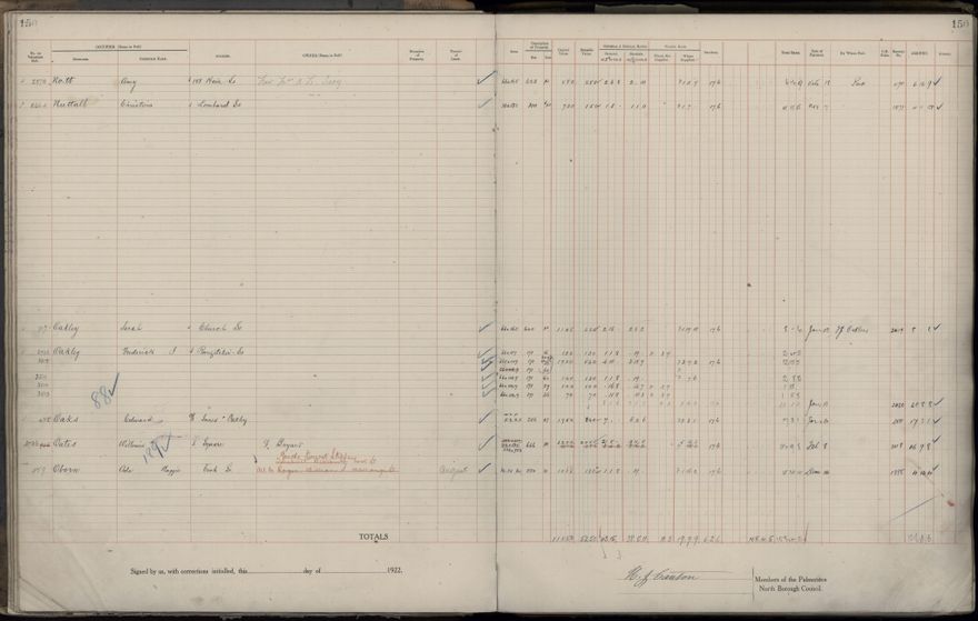 Palmerston North Borough Council rate book, listing rate payers for the years (1 April - 31 March) 1922 - 1923. Gives names, street, owner (if different to rate payer), legal description of property, capital and unimproved values and rates paid.