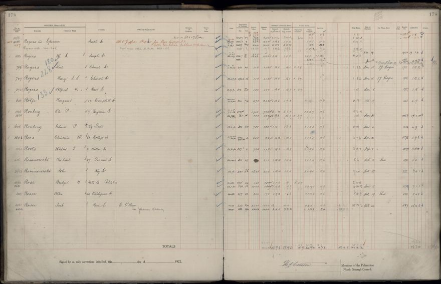 Palmerston North Borough Council rate book, listing rate payers for the years (1 April - 31 March) 1922 - 1923. Gives names, street, owner (if different to rate payer), legal description of property, capital and unimproved values and rates paid.