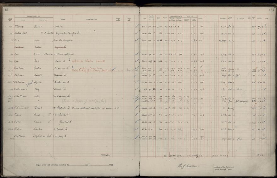 Palmerston North Borough Council rate book, listing rate payers for the years (1 April - 31 March) 1922 - 1923. Gives names, street, owner (if different to rate payer), legal description of property, capital and unimproved values and rates paid.