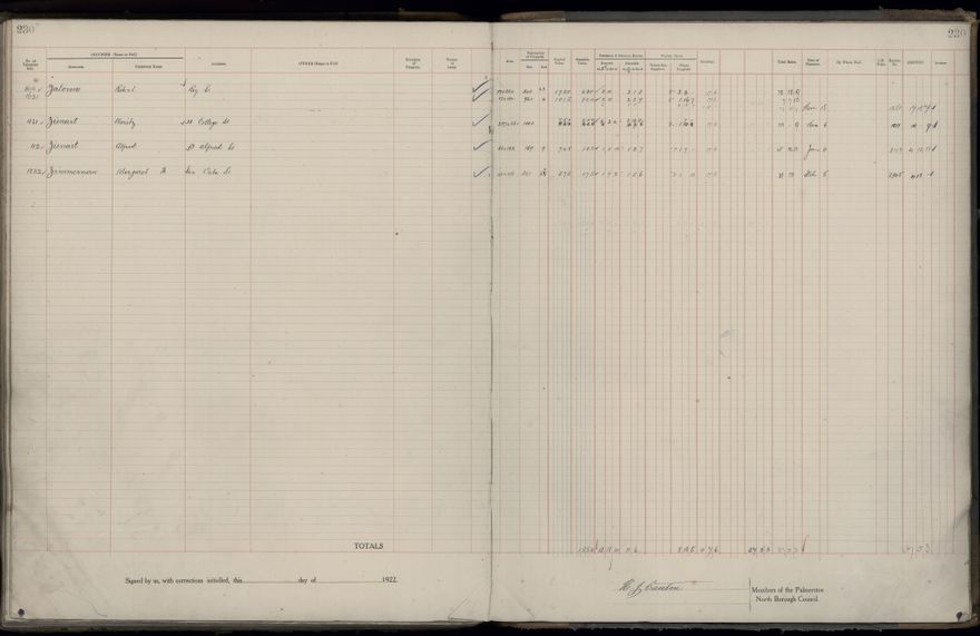 Palmerston North Borough Council rate book, listing rate payers for the years (1 April - 31 March) 1922 - 1923. Gives names, street, owner (if different to rate payer), legal description of property, capital and unimproved values and rates paid.