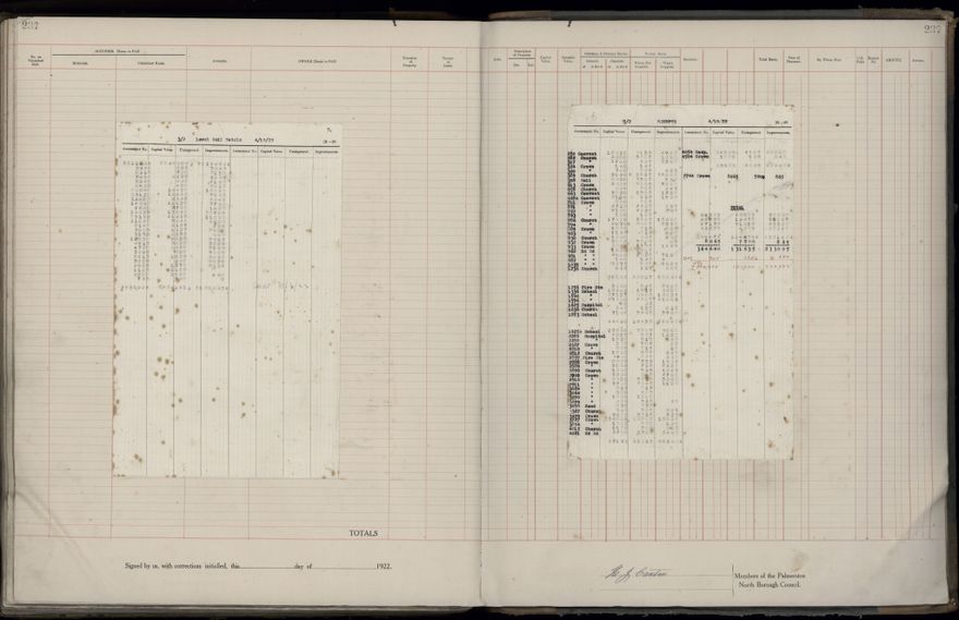 Palmerston North Borough Council rate book, listing rate payers for the years (1 April - 31 March) 1922 - 1923. Gives names, street, owner (if different to rate payer), legal description of property, capital and unimproved values and rates paid.
