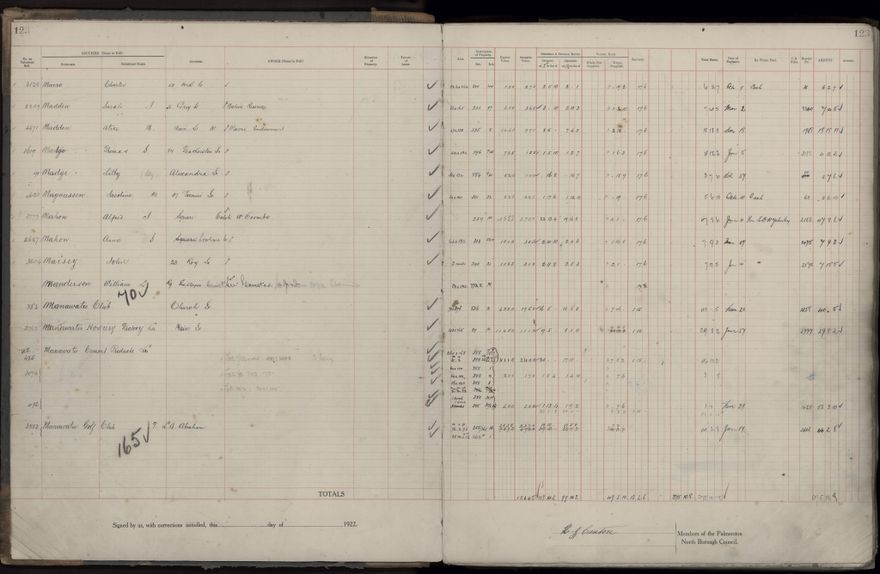 Palmerston North Borough Council rate book, listing rate payers for the years (1 April - 31 March) 1922 - 1923. Gives names, street, owner (if different to rate payer), legal description of property, capital and unimproved values and rates paid.
