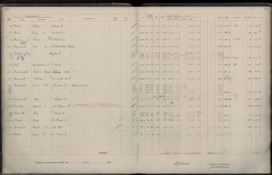 Palmerston North Borough Council rate book, listing rate payers for the years (1 April - 31 March) 1922 - 1923. Gives names, street, owner (if different to rate payer), legal description of property, capital and unimproved values and rates paid.