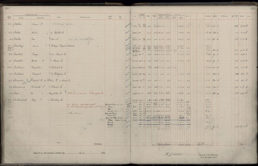 Palmerston North Borough Council rate book, listing rate payers for the years (1 April - 31 March) 1922 - 1923. Gives names, street, owner (if different to rate payer), legal description of property, capital and unimproved values and rates paid.