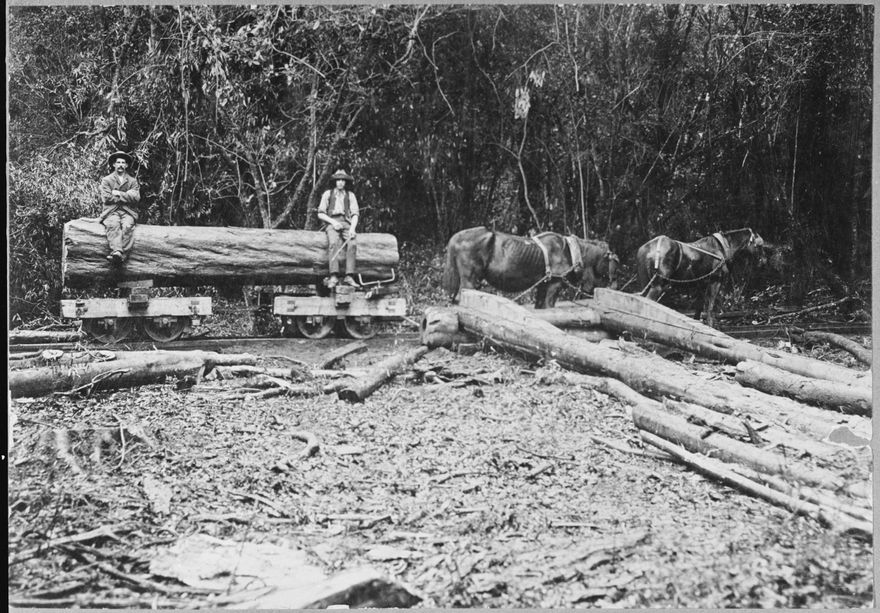 The men are identified as follows (from left) Allan ?, unknown. These men worked at sawmill owned by Jim Climo, with another Climo family member perhaps, and Charlie Eggers. It was situated on Steven Williamson's property on the terrace south of the Waituna Stream, a few hundred yards west of No 377 Main Road and south of the road junction at the settlement of Waituna West. The mill operated for about 2.5 years and cut out a large patch of bush on Williamson's property. Charlie Eggers then went to Raurimu and milled there.