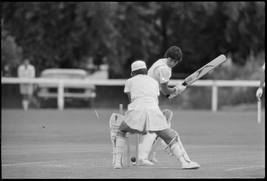 This image was taken by the Evening Standard on 20th of January 1982 and published on the 21st. It depicts the Australian women’s cricket team taking on the International XI women’s team in a limited over match for the Hansell's Vita Fresh Women's World Cup 1981/1982. The match was held at Fitzherbert Park in Palmerston North. The Australian team won by 64 runs.
