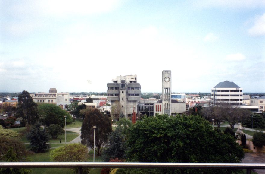 This image was taken from the then Public Library building on the corner of Main Street and The Square. It looks across The Square to the Civic Administration Building (centre) - an example of Brutalism architecture, and often referred to locally as the 'Battleship' - the Hopwood clock tower completed in 1957 and the NZI high rise building.