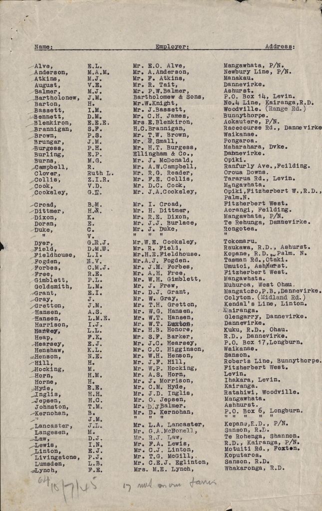 Letter dated 2 July 1945 from the National Service Department District Man-Power Office, with an attached list of the land girls in the district, thier employers names and addresses