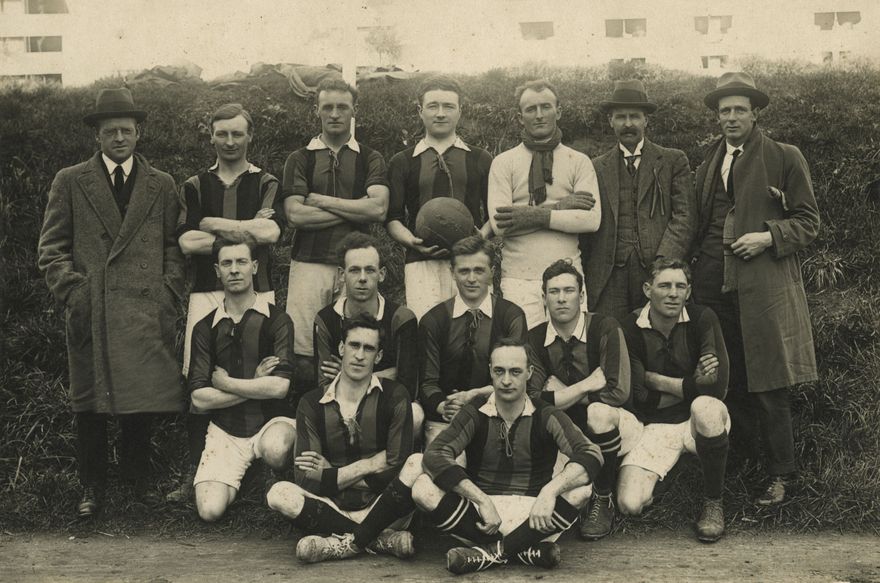 Team members and officials of an unidentified soccer team. Frank Hearsey; Tommy Crowe; ? Kennedy; Charlie Blackburn and Harry Meadows are named as being in the photograph.