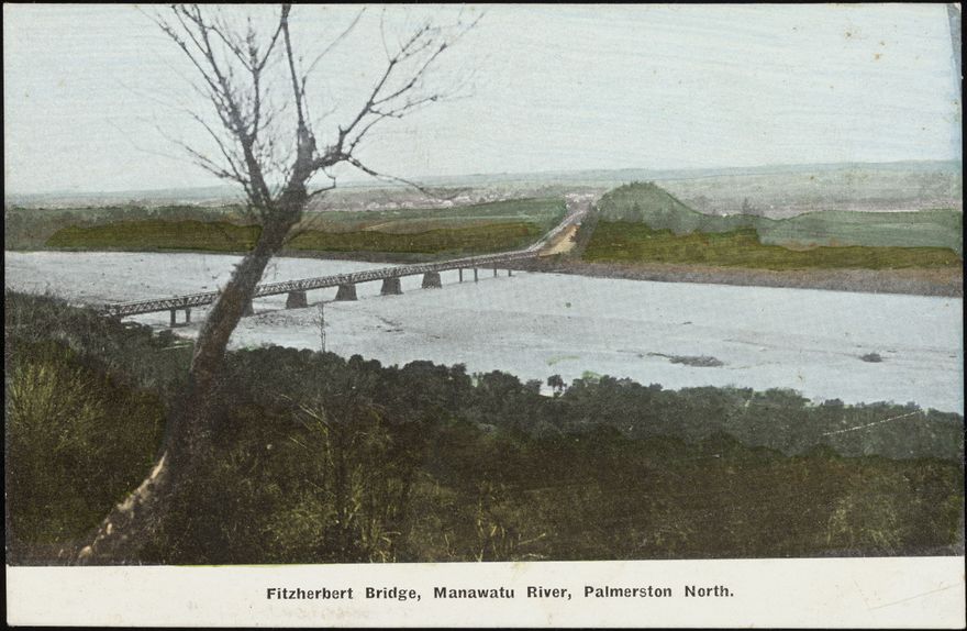 Hand coloured photograph showing view of the Fitzherbert Bridge looking towards Palmerston North, from what is now Anzac Park. The bridge was built in 1877 and was replaced in 1935. Two postcards are held of this image, one postmarked 1906.