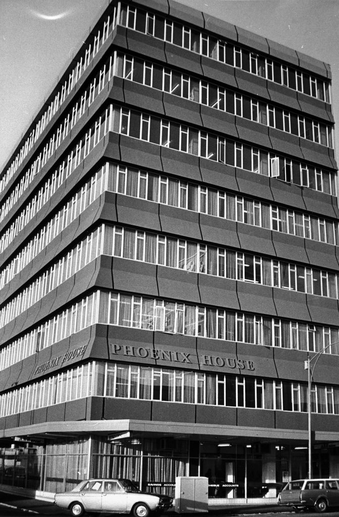 Phoenix House was officially opened on 29 May 1976, by the Mayor of Palmerston North, Brian Elwood. The building was owned by Provident Life, which joined the Phoenix Group of Companies in 1961. The 8-storey building, which cost over $1 million, was built by Street Construction Ltd.
