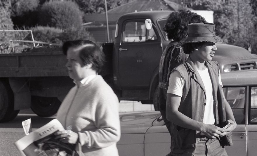 This image was taken (but not used) for a story that ran in The Manawatu Evening Standard on the 30th of April 1970. "Between 40 and 50 people have kept a 'peace vigil' at the Palmerston North Cenotaph since mid-day yesterday - with the Hastings 'Mongrel Mob' in attendance for 'protection' and leaflet distribution.