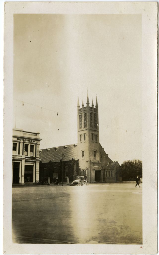 This small photograph album belonged to Mrs R Andrews of Rangitikei House. This photograph bears the caption, "All Saints Church P.N. 5/1/1928". This Anglican church was the third on the site. The first All Saints was built 1875, a second larger building was constructed 1882, incorporating the original building, and the third and current All Saints built in 1914. To the left of the church is the Municipal Buildings. It was constructed in 1890 and was first used as the Colonial Bank of New Zealand. This was then purchased by the Borough Council and housed the Council Chamber as well as the Municipal Offices and the Public Library (as seen here). Later in 1944-1945 a new council office was built including the shops alongside. This is now Square Edge.