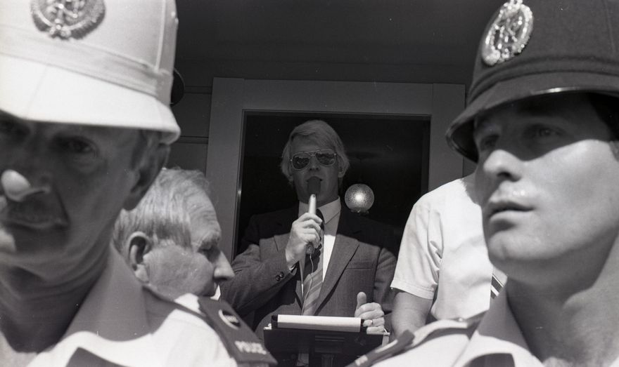 This series of images was taken for a story that ran in on the front page of The Manawatu Evening Standard on 10 February, 1987. The story pertains to the mortgagee auction of a farm owned by Paul Geurtjens of Bulls. Up to 700 protesters attended the auction at Harcourts real estate on Fitzherbert Avenue. Auction proceedings were interrupted by protesters placing false bids and drowning out proceedings. The property was not sold as it didn’t raise a bid. The images of Longburn workers protesting appear on the same roll of film, however it is unclear if theese are from the same event.