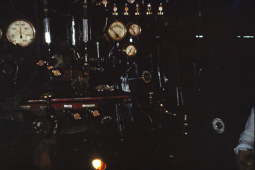 The backhead of a KA class locomotive. Located on the end of the firebox inside the cab, the backhead contains most of a locomotive's controls.