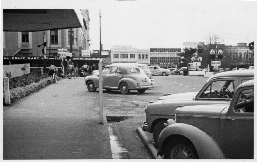 This photograph looks past Main Street West and onto the corner of Coleman Place (now Coleman Mall). Railway signals stand in the centre of the street, where the train crossed to run through The Square. Some of the businesses that are visible are the Commericial Fruit Mart, Capstan, Craven A, Pararubber and McKenzies.