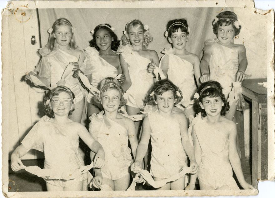 A group of nine dancers dressed in costume, pupils of the well-known Palmerston North dance teacher Zona Broughton. They include Toni Shaw and Vicky Broughton.