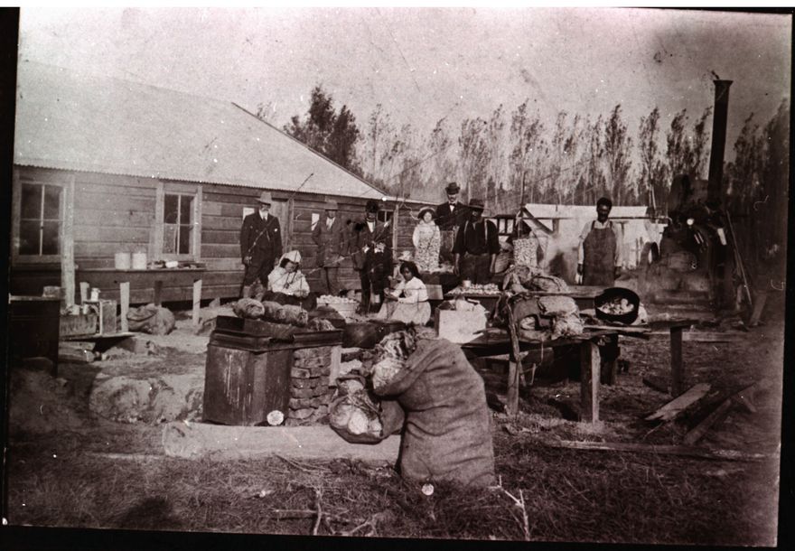 I te taha o te tiriti o Pioneer Highway i hangaia tētahi tāone iti me tētahi marae ko Kikiwhenua te ingoa. I hangaia ai te marae i te tau 1883. Ko tēnei whakaahua e whakaatu ana i tēnei marae? I kōrero a Ian Matheson ki te whānau o Te Awe Awe. Ki a rātou ko Hare Rakena Te Awe Awe te tangata e tū ana ki te muri whakamauī, ko Manawaroa te tangata e tū tuarua ana ki te taha whakamatau. Possibly the Marae at Awapuni, built in 1883. Albert Rickard, the photographer, was manager of the Awapuni Skimming Station.