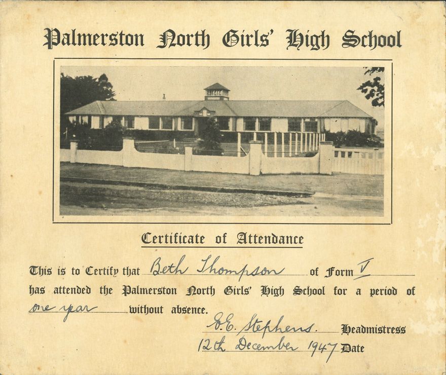 Certificate of Attendance certifying that Beth Thompson of Form 5 had attended Palmerston NOrth Girls' High School for the year without absence. signed by Headmistress, E. E. Stephens.