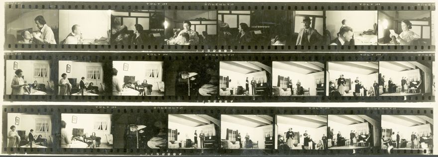 A proof sheet of images taken of what appears to be a play being performed, showing actors putting on make up and backstage, and scenes on stage.