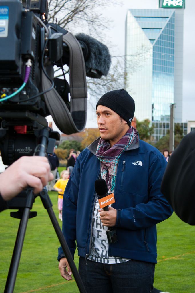 TV One News sent breakfast reporters Tamati Coffey and Petra Bagust to cover the early morning ‘Rippa Rugby’ game between local school children representing the nations of Romania and Georgia who were set to play their Rugby World Cup match in Palmerston North later that night.