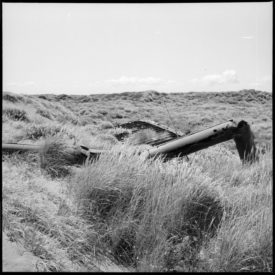 This image was taken for a story that ran in The Manawatu Evening Standard on 3rd December 1965 "The wreck of the barque Fusilier as she lies between the Turakina and Rangitikei Beaches. The tall mass of the ship were for years a survey point, but now they have collapsed through age and rust, the last one quite recently. On the top of the picture the build-up of sand can be seen. There the hill of the Fusilier is now lying was once high water mark. They Fusilier was beached during a gale in 1878 and two unsuccessful attempts were made to refloat the vessel."