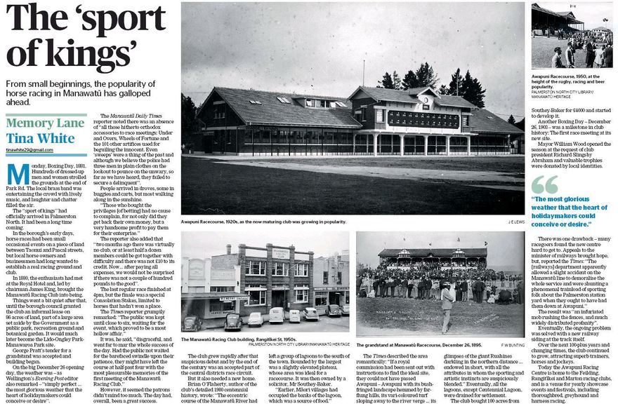 Journalist Tina White's weekly "Memory Lane" article in the Manawatū Standard. The beginning and early days of horse racing in the Manawatū, from 1880.