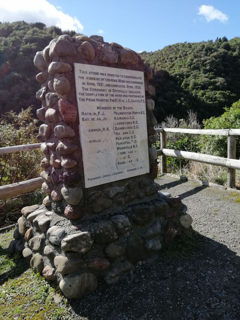 Plaque erected to commemorate the widening of the Manwatū Gorge Road, between 1921 - 1926. This plaque sits at the Ashhurst end, near the beginning of the former road that ran through the Gorge, and can still be viewed on foot.