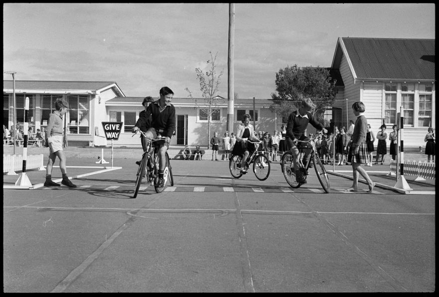 This image was taken for a story that ran in The Manawatu Evening Standard on 2 May, 1963. "The schoolchildren of the Rongotea School had an exciting day with week. The school tennis courts were set up with road-safety training equipment, and the children impatiently waited to have a turn at "driving" the various cars and cycles. Under the watching eye of traffic instructor C. Boyle, of Marton, senior pupils were instructing small groups of the primary children in many aspects of road safety. Not for one moment did the children's interest flag as they completed the various safety drills. The training equipment valued at over £1200, has been in use at many schools and imparted much early training to the younger children. The parents visited the training area and recieved exactly the same training. The top left photograph shows the children doing their pedestrian-crossing drill, while the "motorist" complies with the law. The top-right picture shows the children learning how to cross safely between parked cars. Bottom left shows the correct kerb drill and bottom right shows what not to do -- children riding four abreast, ignoring the pedestrian on the crossing, swerving over the road and inviting injury or possible death."