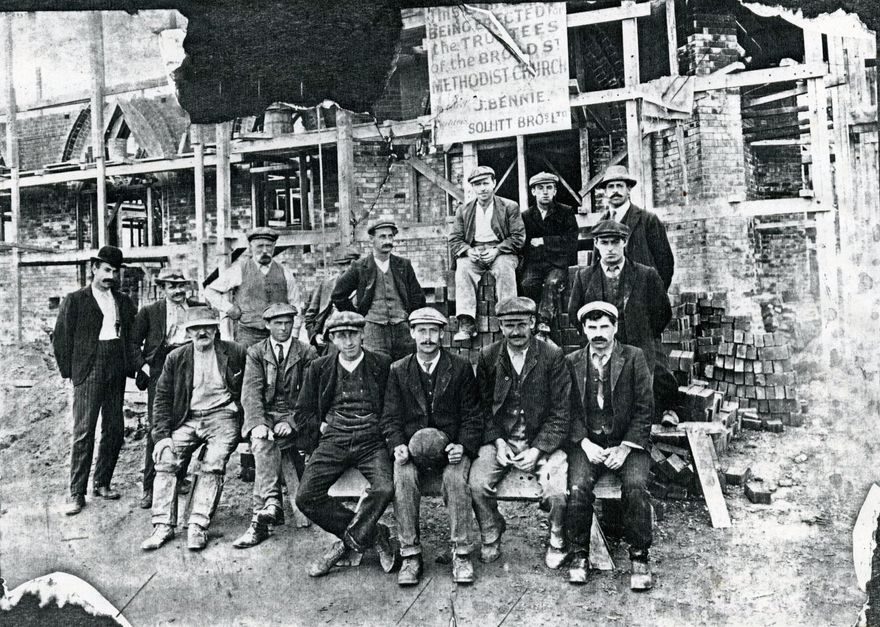- Builders of the Third Methodist Church. H. White (centre front - with ball), Charles Randall (front row, second from right), W. Falls (front row, far left), E. Dymock (back row, far right), other unidentified. The new church was designed by James Bennie in 1911 and worship commenced in the new building in June 1913.