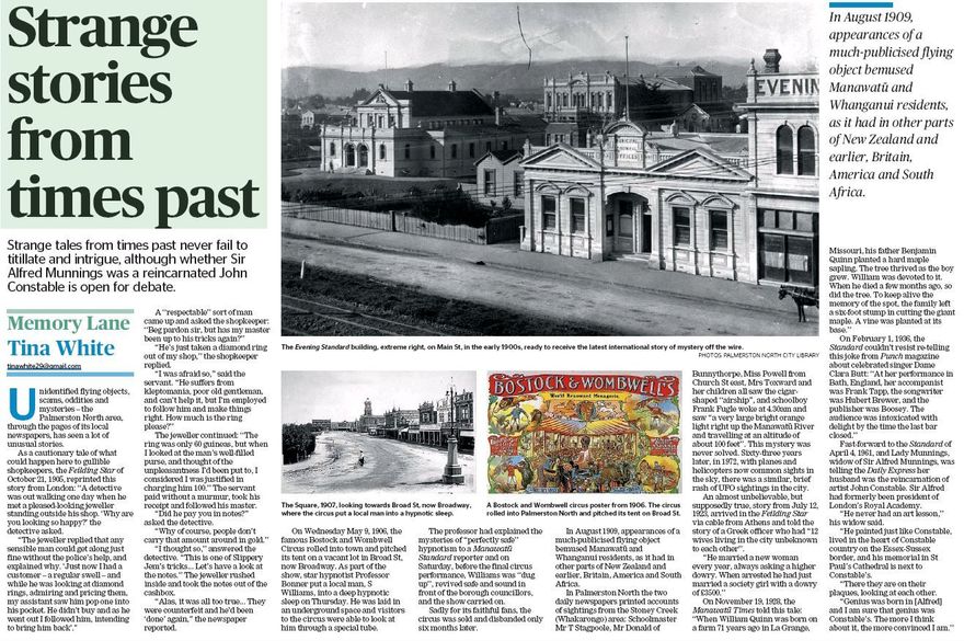 Journalist Tina White's weekly "Memory Lane" article in the Manawatū Standard. A selection of unusual stories reported in past issues of the Manawatū Standard.